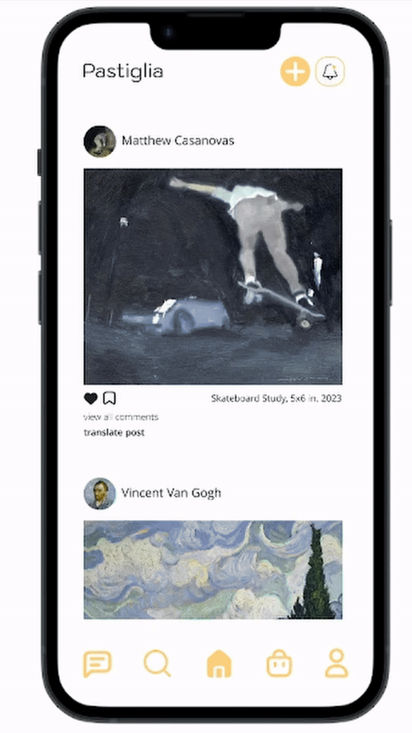Pastiglia is an app created to encourage artists to create, promote, and sell work independently. This app aims to be both a marketplace, and social media, with the purpose of creating a space that helps artists sustain themselves. With options to explore digitally, and opportunities to view artwork in person, Pastiglia will help users cultivate a one of a kind art collection as well as become immersed in one of the most unique cultures.